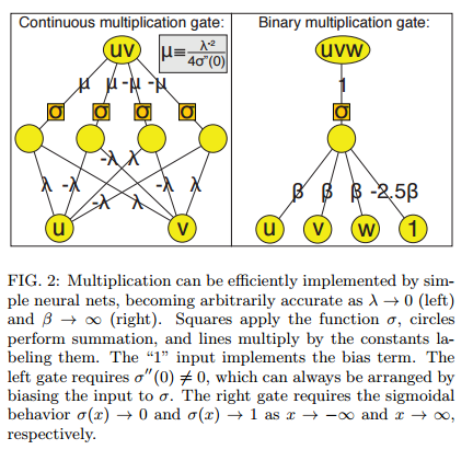It turns out we can approximate a multiplication gate arbitrarily well using the logistic sigmoid activation function (fancy name, but commonly used) σ(x) = 1/(1 + e-x). In fact, with this machinery, arbitrarily accurate multiplication can always be achieved using merely 4 neurons.