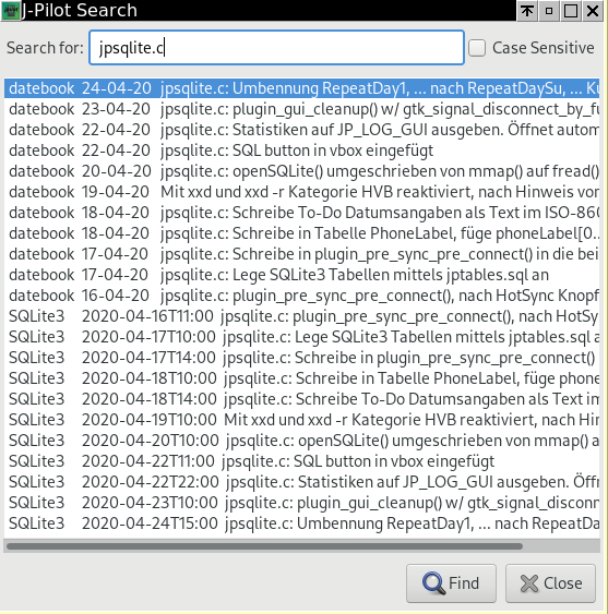 3. In debug mode you can use J-Pilot's search to search in the SQLite database