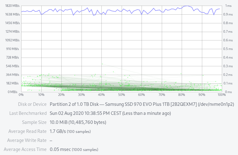 In continuation of blog-post SSD Speed on Dell XPS 13 9350, here are performance measurements for a Samsung EVO 970 Plus in Dell XPS 13.
