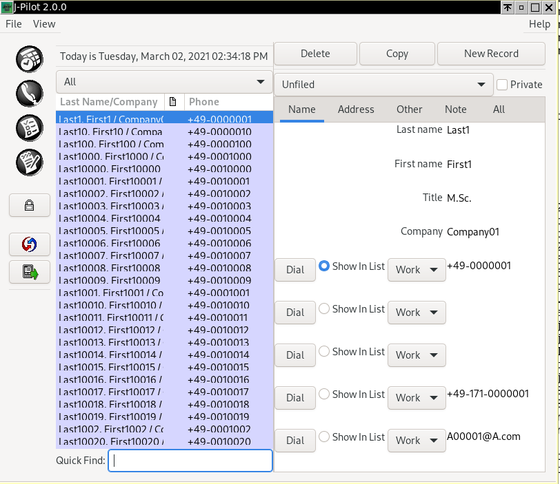 U1. To quickly get "mass"-data for a possible buggy J-Pilot software, I prepared a Perl script palmgencsv to generate address- and datebook-CSV files. For example: