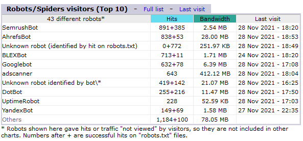 4. Example output. Output of AWStats for the overview for spiders and bots looks similar to this: