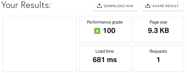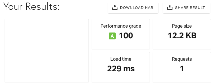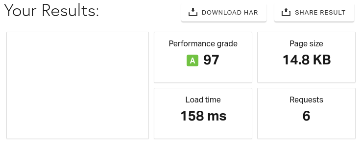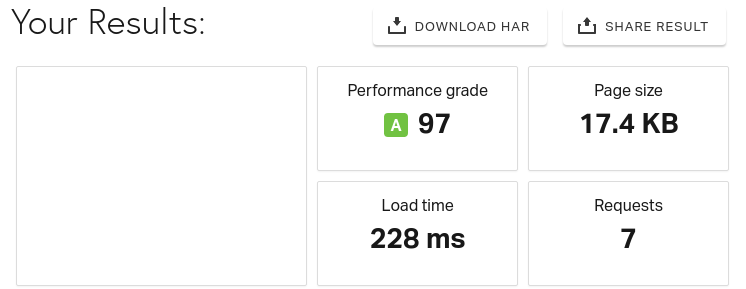 For the blog post Simplified Saaze I measured performance grade C80, page size 54.5 KB, load time 1.67s, and 33 requests in November 2021. I tested for Washington D.C. and used unpkg.com for prism.js. See Accelerating Page Load Times by Reducing Requests. When serving prism.js locally and combining into a single JavaScript file, performance grade improved to A93, page size shrank to 44.2 KB, load time decreased to 947ms using 9 requests. All from Washington D.C.