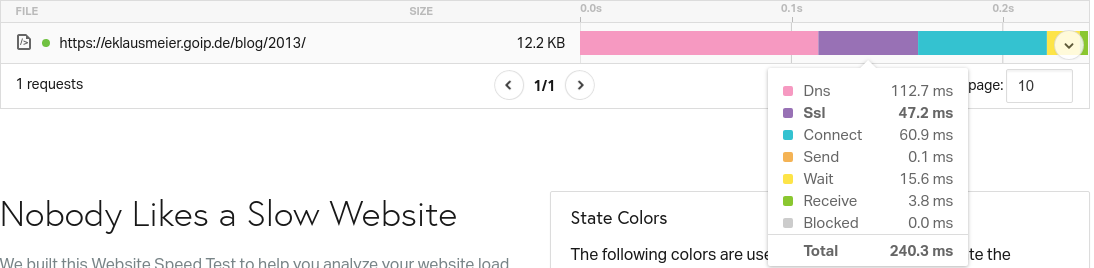 2. Comparing to previous results. The blog post Moved Blog To eklausmeier.goip.de is a small post, containing only text. In Speed-Tests With Pingdom.com I measured performance grade B87, page size 332.9 KB, load time 1.06s, and 18 requests from Washington D.C. At that time, May 2021, I used Tailwind CSS. Now the results are performance grade A100, page size 9.3 KB, load time 681ms, number of requests 1, also serving Washington D.C.