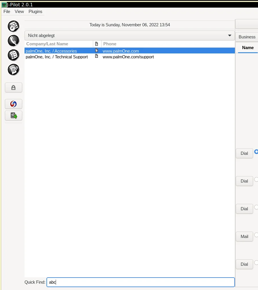 Added 30-Mar-2023: Switching screen bug, i.e., switching from address to memo for example, with function keys (F1, F2, etc.) multiple times, will crash J-Pilot. When clicking on large icons for switching, it will not crash. After some testing: The problem only occurs when switching to address. It does not occur when switching between datebook, memo or ToDo.