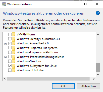 On Windows make sure, whether "Windows Subsystem for Linux" is checked. Run optionalfeatures.exe: