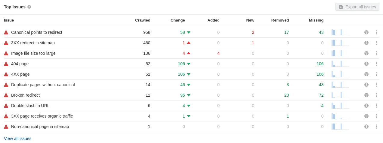 Below table shows a handy overview of your issues. A very common issue are 404-pages.