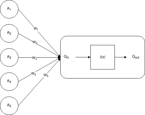 Input to node $Q$ is given in $A_i\in\mathbb{R}$, weights $W_i\in\mathbb{R}$, then node $Q$ computes