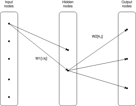 Multiple "neurons" from above can be stacked together. All nodes, which are not directly connected to input or output, are called "hidden layers". Below is a three-layer neural network.