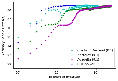 Fewer iterations or presentations of the data to the network are needed to reach optimal performance. [Though] The use of a ODE solver requires significantly greater computation time.