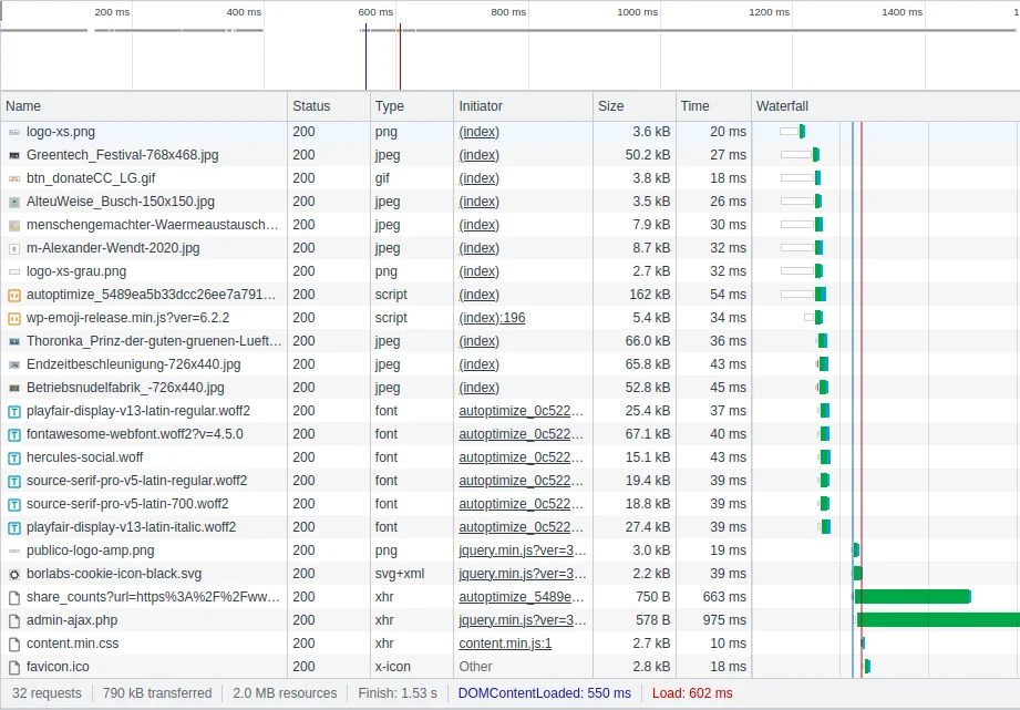 Below waterfall diagram in Google Chrome shows, where time is spent, same page as above.