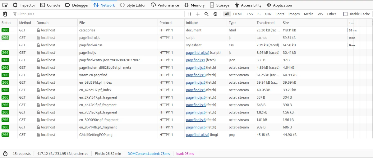 4. Network traffic. Pagefind was particularly designed to only load small amounts of data over the network. This can be seen from below diagram.