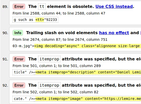 7. HTML validation. The original site lemire.me contains more than 90 warnings and errors. See W3 Nu Html Checker.