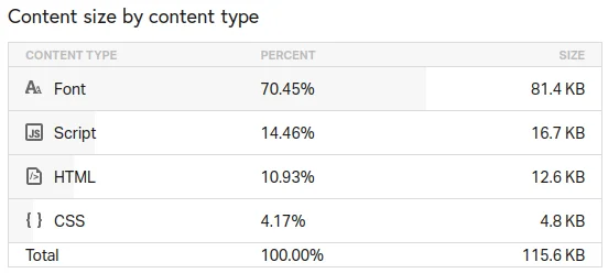 According How many bytes is “normal” for a web font: a study using Google fonts we should expect only 20 kB per font.