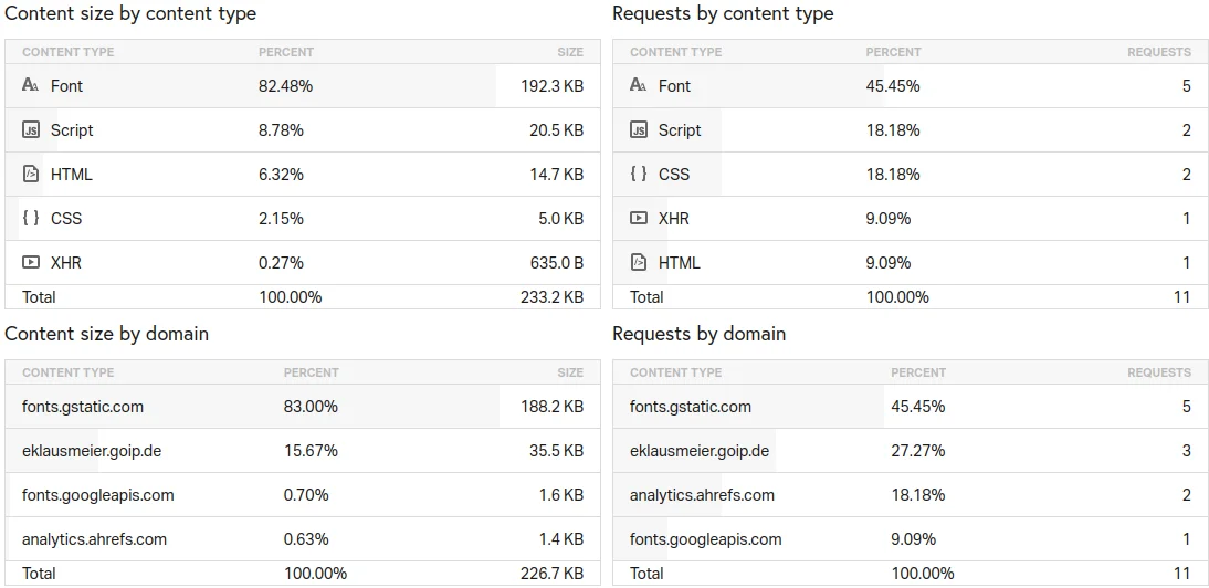 For example, the post Moved Blog To eklausmeier.goip.de measured with tools.pingdom.com loads in 244ms from Frankfurt and needs 8 requests.