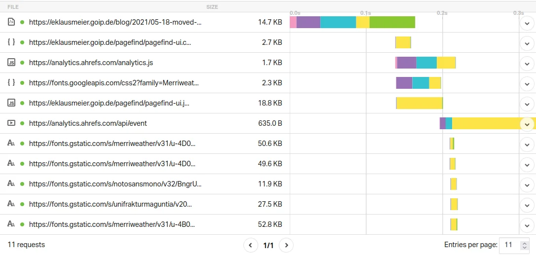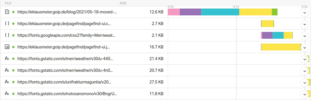 Looking at the waterfall diagram one can see that dropping fonts would not lead to any significant faster website. This is because Google is pretty fast serving all those fonts. Similarly, Pagefind's processing can be seen overlapping the other processing, so not adding much waiting.