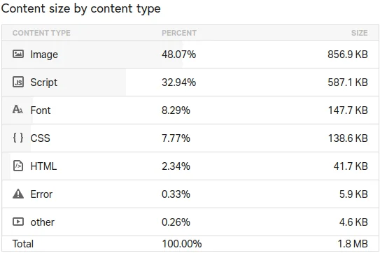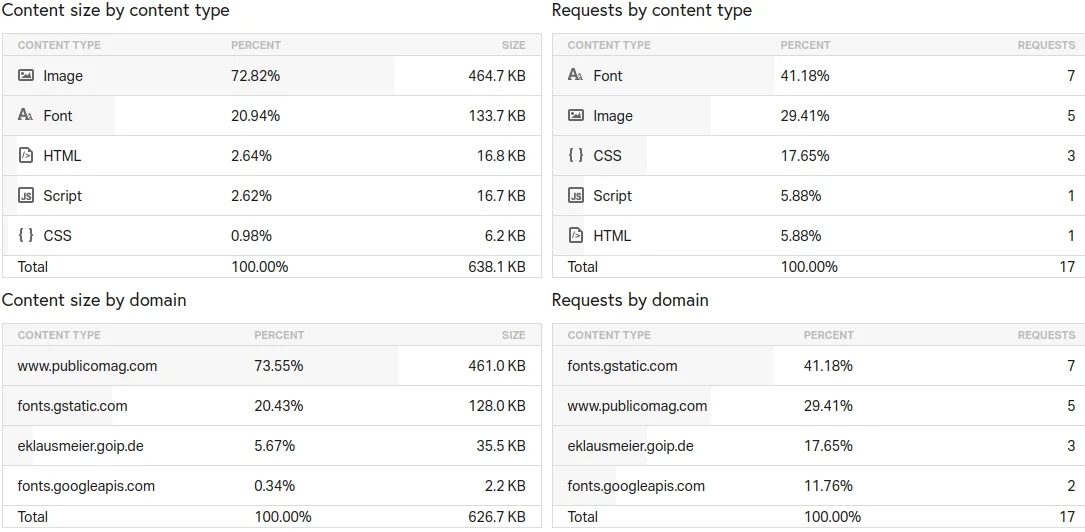 One can clearly see that half of the page size are images, one third is JavaScript, fonts and CSS each have roughly 8%, the actual HTML content is just 2%.