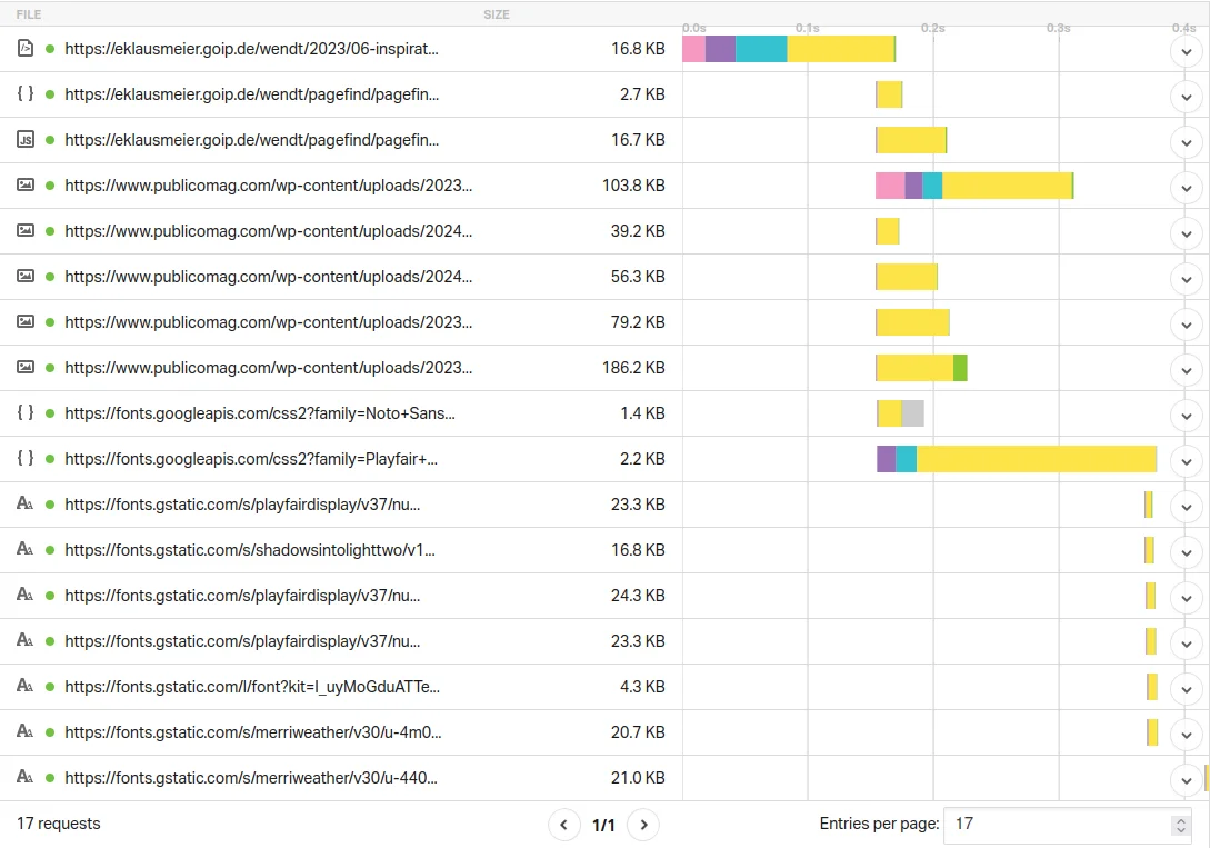 Actual loading of the modified site will roughly follow below waterfall diagram. This waterfall diagram shows that a major part of the loading time is spent in loading Google's Playfair fonts. This is quite surprising. The other fonts from Google load in record time.