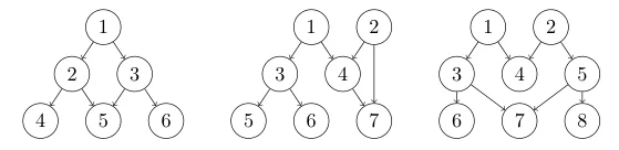 The left graph is unambiguous with respect to nodes $1$ and $6$ but not reach-unambiguous with respect to node $1$, the middle one is reach-unambiguous with respect to node $1$ but not strongly unambiguous and the right one is strongly unambiguous.